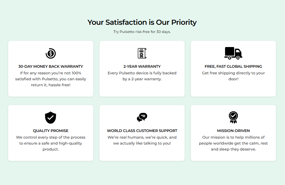Try Pulsetto for a full 30 days. If you don't feel a meaningful improvement in your stress, sleep or anxiety levels, simply send it back — no questions asked. We want you to feel calm and in control again, without any risk.